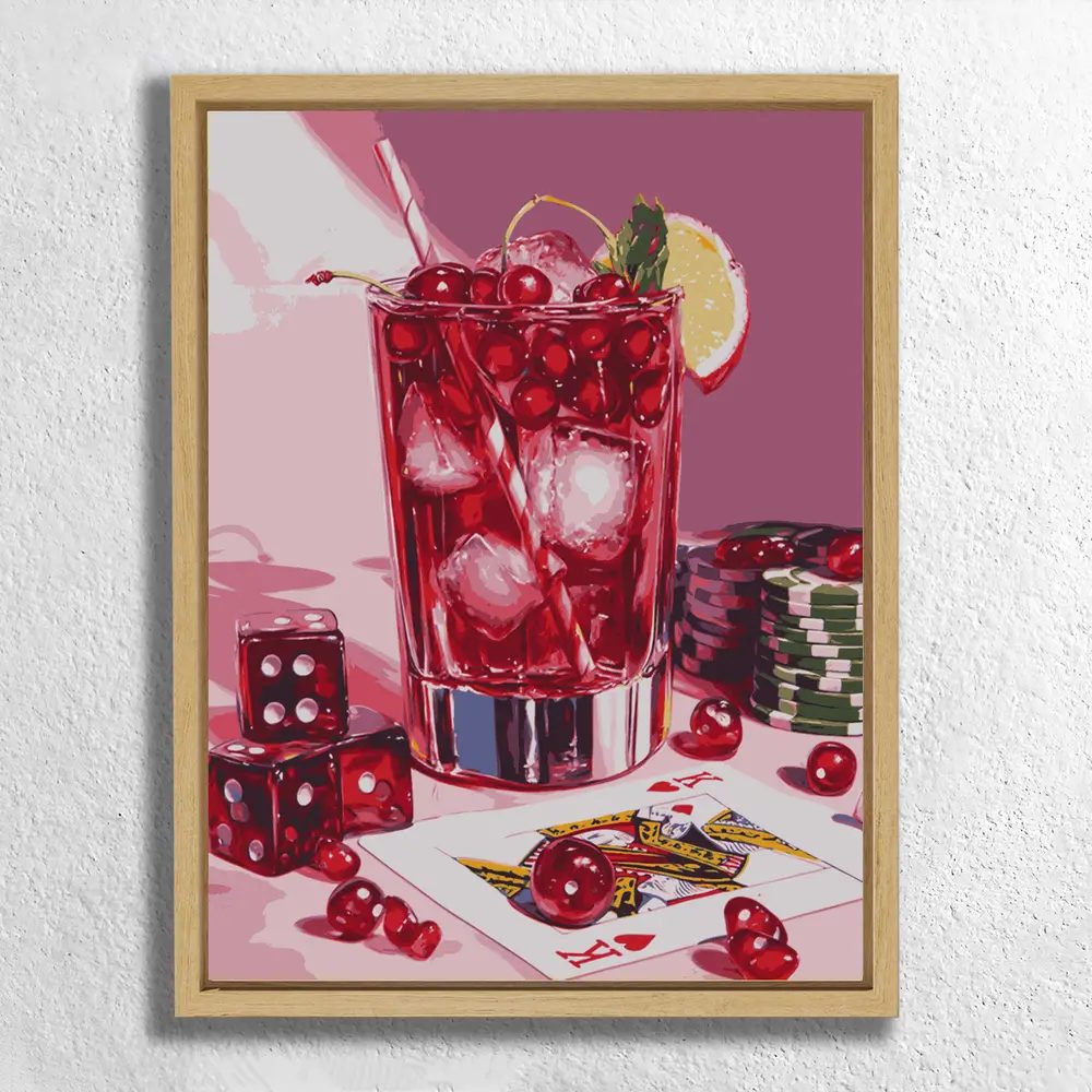 Mit dem Motiv „Kirsch-Cocktail & Casino-Vibes“ holst du dir das prickelnde Nachtleben direkt an deine Wand. Ein leuchtend roter Cocktail, verlockende Kirschen, Spielkarten und Würfel schaffen eine Atmosphäre voller Spannung und Sinnlichkeit.