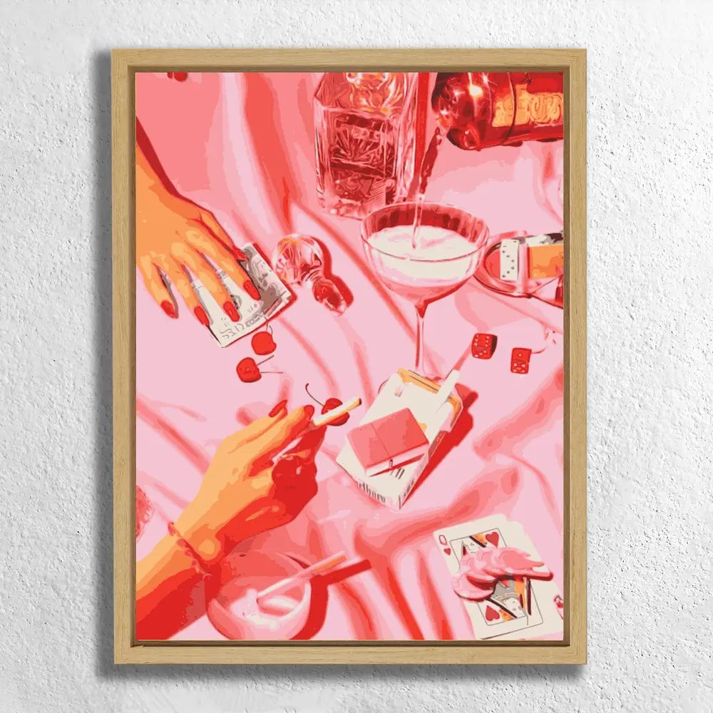 Das Malen-nach-Zahlen-Set „Kirschträume & Casino-Nächte“ ist ein ausdrucksstarkes Motiv voller Retro-Glamour und provokanter Details. Spielkarten, Cocktail, Kirschen, Zigaretten und glänzende Accessoires auf einem pinken Satinuntergrund vermitteln eine vibrierende Mischung aus Luxus und Rebellion.